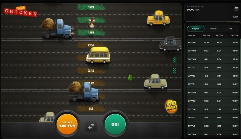 Jak działa Chicken CrashKurczak przebiega przez drogę z ruchem pojazdów. Każdy krok zwiększa mnożnik. Musisz wypłacić przed kolizją – w przeciwnym razie tracisz zakład.